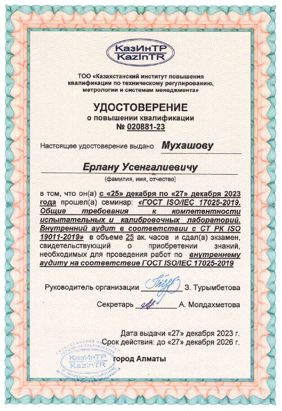Удостоверение о повышении квалификации кадров. №020881-23. Мухашов Е.У.